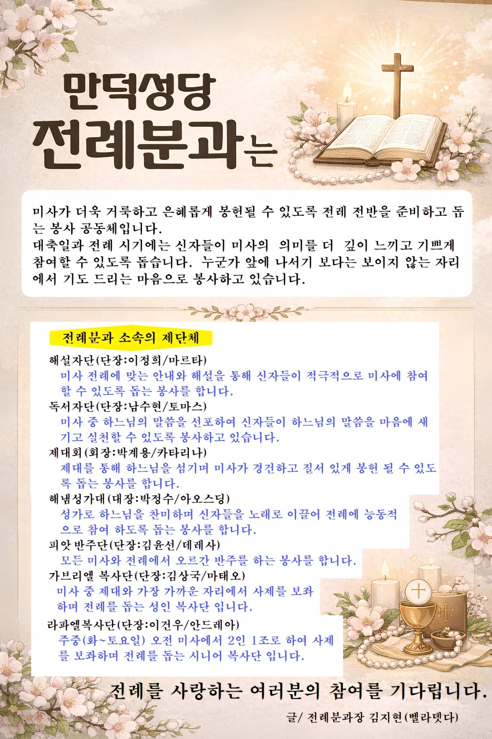 전례분과 페이지 정보 작성자 관리자 댓글 0건 조회 126회 작성일 26-02-08 10:59 목록 답변 본문 글/이미지 전례분과장 김지현(벨라뎃다) 이전글미카엘복사단 26.02.08 다음글교육분과 26.02.02 댓글 0 댓글목록 등록된 댓글이 없습니다.
